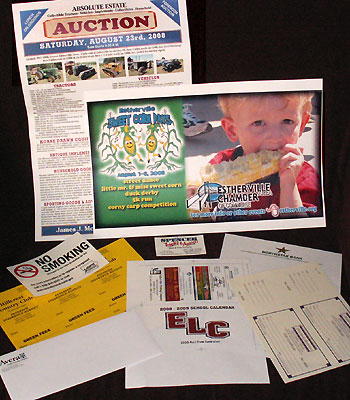 Goods and ServicesAt Estherville Printing we have a long tradition of providing high-quality printing services. In addition, we offer a complete line of advertising specialties, trophies and awards. Our line of Carlson Craft wedding invitations is the finest available anywhere. ![]() Our company slogan is: "If you're not happy, we're not happy. And if we're not happy, you'll never see it." This means that every printed piece we produce here must pass our exacting standards. If a piece doesn't pass, it will be re-done before you ever lay eyes on it. Our goal is always to produce the finest printed materials that you could get anywhere. PrintingLetterhead and Envelope (raised print, flat print, one color, multi-color, full-color) ![]() Advertising SpecialtiesItems include mugs, can coolers, combs, table covers, screwdrivers, magnets, calendars, sport bottles, pens and pencils. ![]() TrophiesResin Trophies and Shields AwardsPlaques In Walnut and Laminate (brass or aluminum plates) ![]() ![]() EngravingDesk Name Sets Weddings and InvitationsWe are an authorized Carlson Craft ® Dealer ![]() ![]()